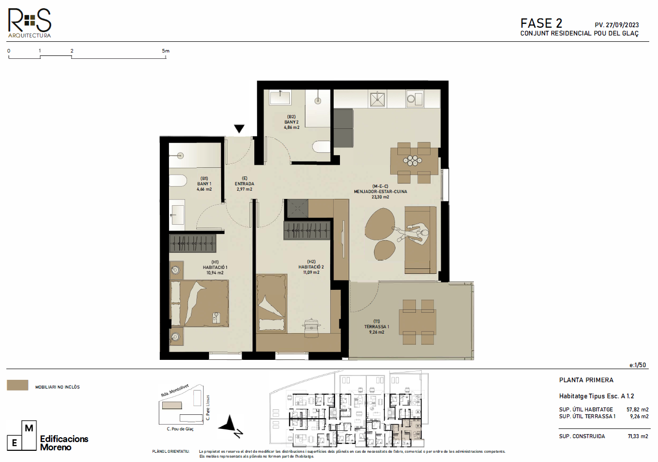 Pis que consta de dues habitacions, menjador-sala d’estar i cuina, 2 banys i una magnífica terrassa. Ben situat amb espais verds i zones comercials, per poder gaudir de totes les comoditats de viure al centre.