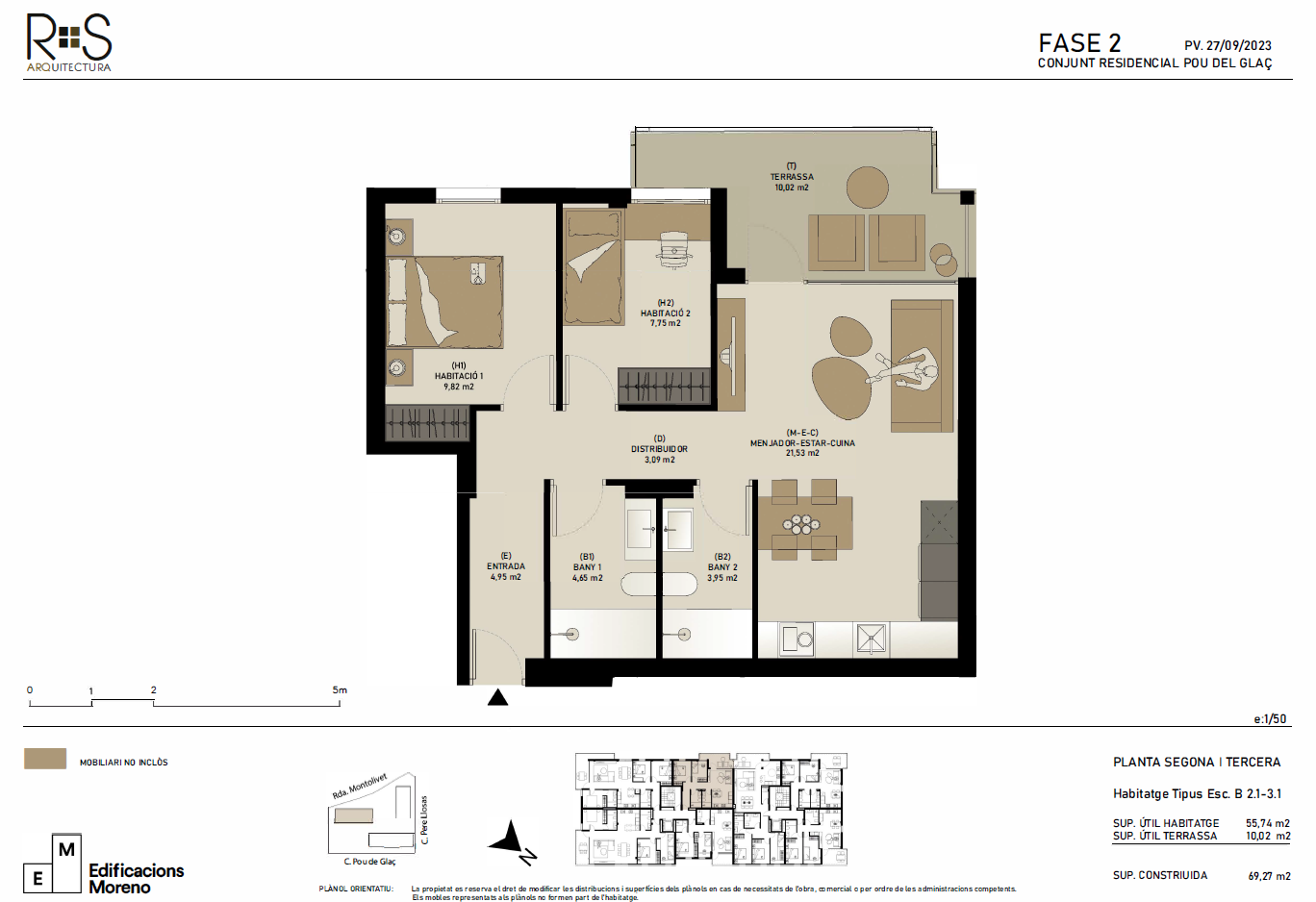 Pis que consta de dues habitacions, menjador-sala d’estar i cuina, 2 banys i una magnífica terrassa. Ben situat amb espais verds i zones comercials, per poder gaudir de totes les comoditats de viure al centre.